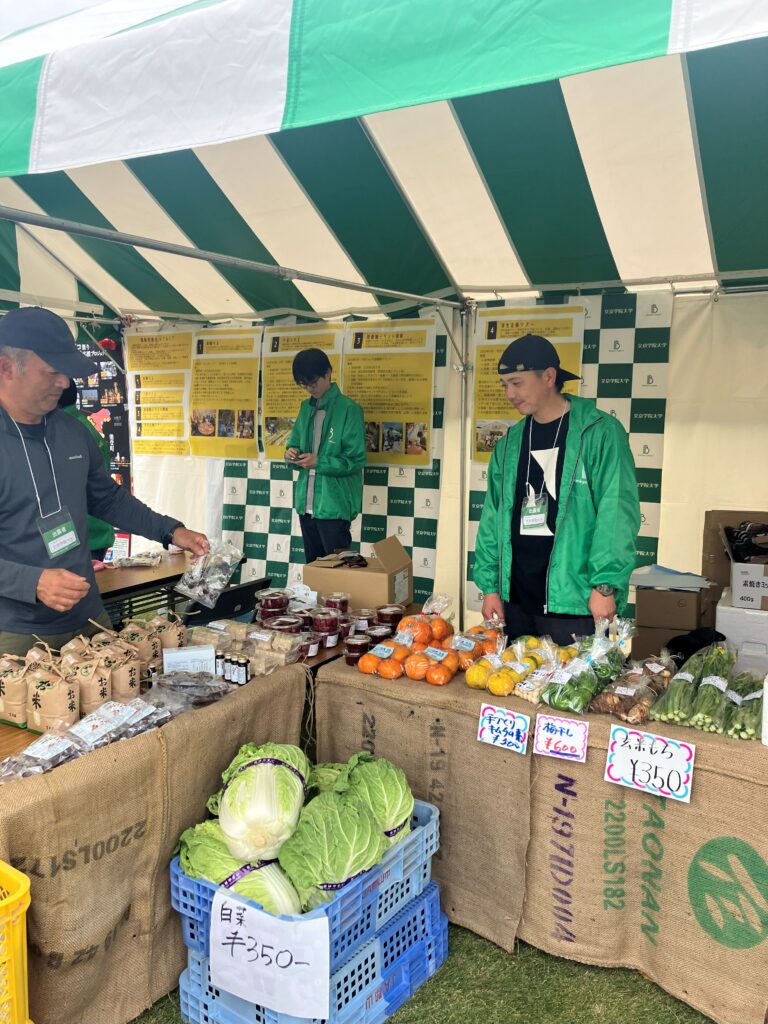 会場となった風景式庭園エリアには、2万人近い来場者が訪れ、各地の環境・地域活動が紹介される中、福島県郡山市逢瀬町からも新鮮な野菜と竹の遊び道具が並びました。